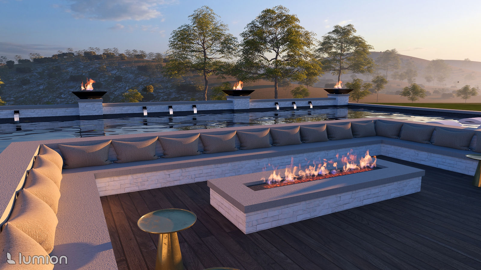 Add movement, sound, warmth, and evening drama with spas, scuppers, deck jets, waterfalls, fire bowls, and fire pits.